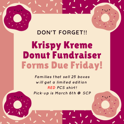 Don't forget PCS fam! Krispy Kreme order forms are due this coming Friday - bring them in to your coaches ASAP! If you sell more than 25 boxes, you will get a limited edition RED PCS shirt! Pick-up is March 6th at SCP!