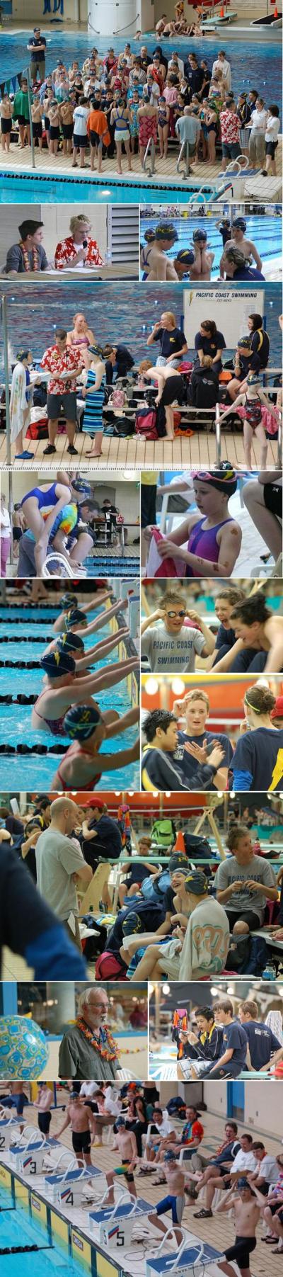 Eight teams and 183 swimmers from BC and Washington descended on Saanich Commonwealth Place for the Sixth Annual PCS 14 & under Wavemaker Invitational and we had a great time underneath the palm trees and bouncing beach balls. Officials set a fine standard for beach wear (even one grass skirt) and competitors enjoyed ice cream ... that is...carrots... on the final morning after heats. Fun and fast swimming!
