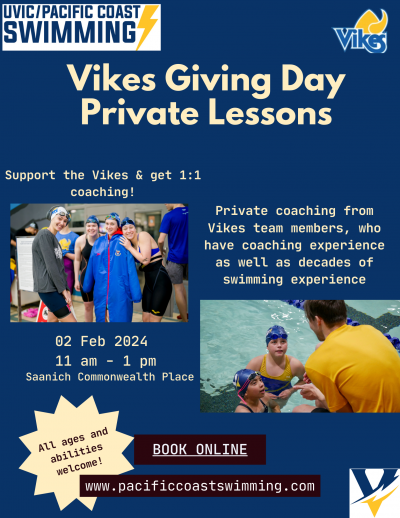 Support Uvic's Varsity Swim Team with Vikes Giving Day private lessons! Enjoy private coaching from Vikes team members, who have coaching experience as well as decades of swimming experience - focused on skills and technique of your choice!