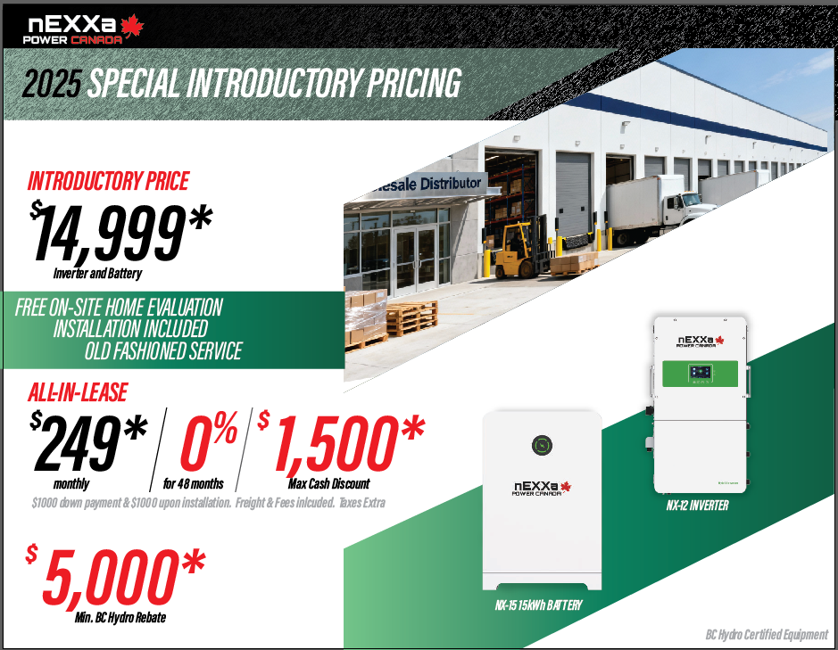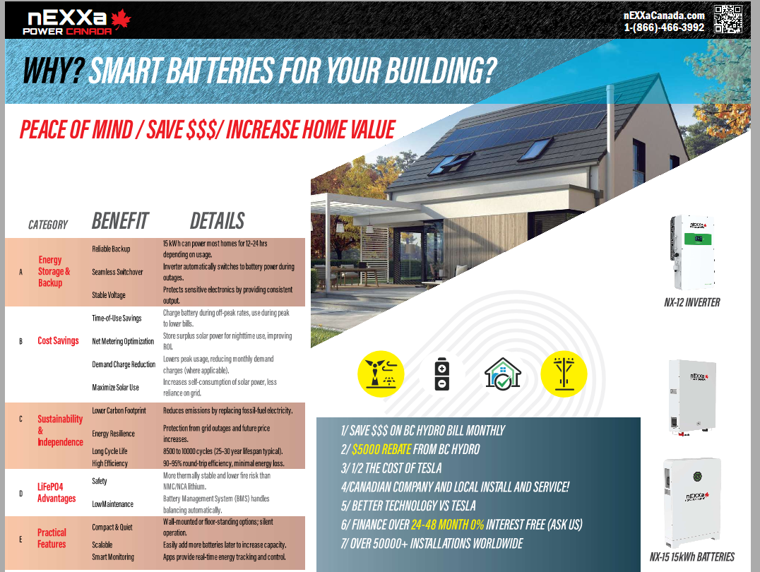 nEXXa’s NX-15 Smart Battery and NX-12 Inverter systems are BC Hydro certified and designed for Canadian homes and conditions. They offer a wide range of benefits: